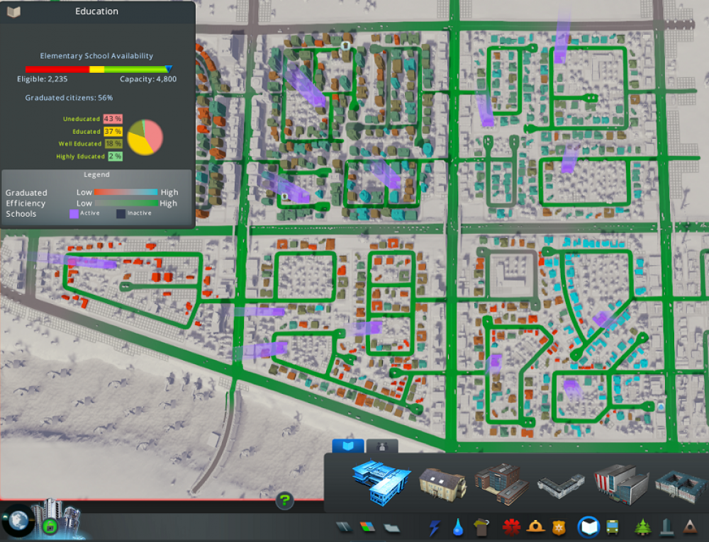 - Le tracé des routes ne tenait compte que des zones et non des bâtiments publics. Ainsi, il s'est avéré très difficile de caser des infrastructures (parcs, écoles, police, pompiers, déchets, cimetière, etc.). Il vaut mieux placer de tels bâtiments au début du tracé du quartier, et seulement ensuite terminer le quartier autour d'eux, ce qui permet en plus de les mettre en valeur.
